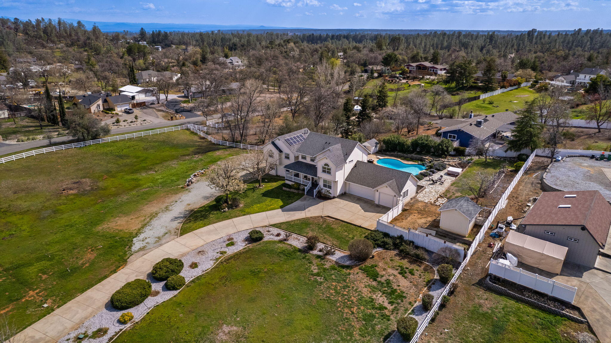 All American Dream Home in Grant School District on ~2 acres! Gorgeous home checks ALL the boxes w stunning pool, guest/pool house w laundry, OWNED SOLAR, attchd 3 car garage + 2 car SHOP! Need multigen living or rental income to offset your mortgage? Or use the extra space to entertain in the pool house! Home has the best curb appeal w wrap around porch & classic architecture. Main hm: Dedicated spaces so friends & family can spread out without being disturbed by what's happening in other rooms. Lots of storage space & large closets! Convenient upstairs laundry. Bright kitchen w breakfast bar. 3 beds/2.5 baths. Guest Hm: Open floor plan w kitchenette, full bath & laundry. Current owner has $0 elec bill. Gated RV/Boat Parking, covered deck & loads of fruit trees